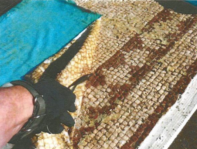 A restoration report submitted in support of the memo demonstrated that the mosaic may have been removed from its base in the late 1960’s or 1970’s because of the kind of glue used to hold a fabric attached to the artifact’s surface. There also was evidence that the mosaic had been rolled like a carpet following its removal. A photograph published in the restoration report (seen here) shows a fold.