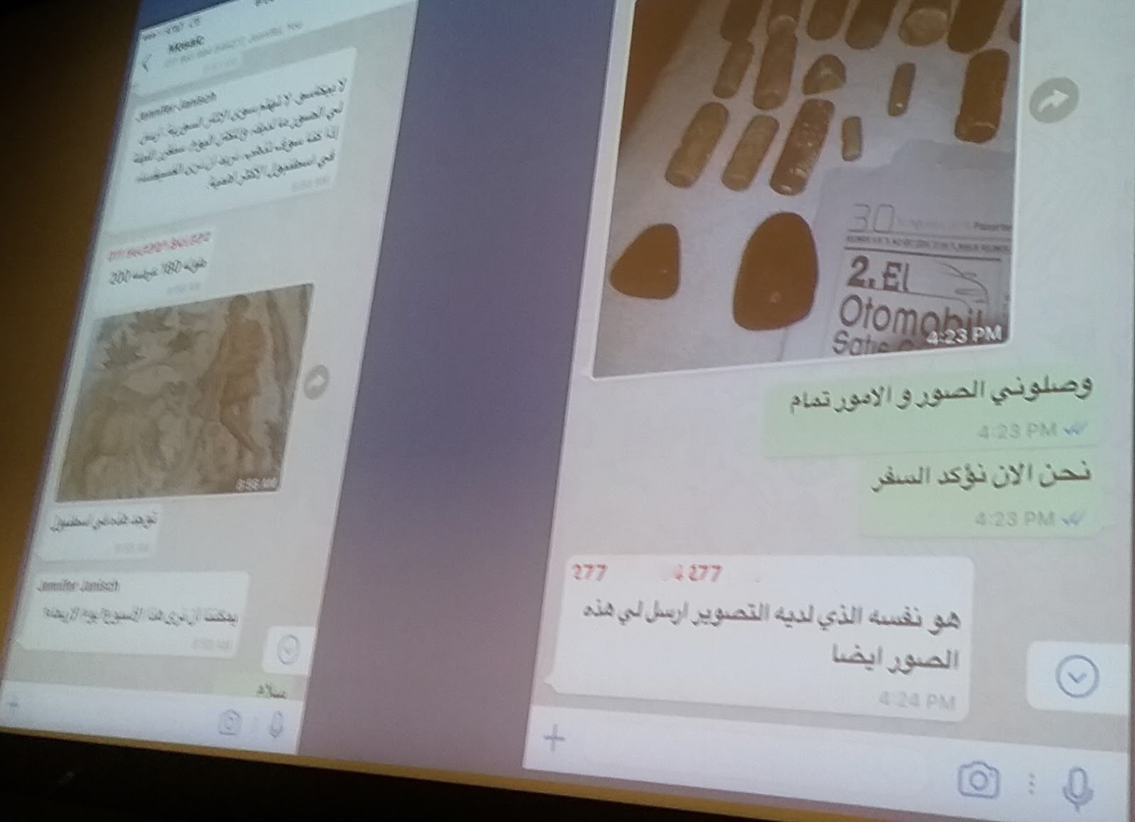 Syrian archaeologist Dr. Amr al-Azm, who spoke at last month’s conference on Preserving Cultural Heritage in Times of Conflict, showed screen shots (seen here) of a mobile phone application being used to sell an ancient mosaic and cylinder seals, saying “This is an example of how some of this stuff gets traded.” “We get these messages going on back and forth all the time.”